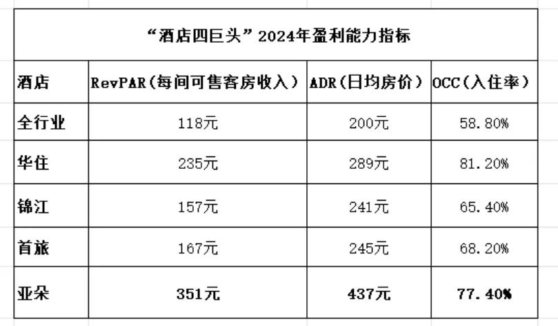 根據(jù)酒店之家數(shù)據(jù),2024年全行業(yè)的ADR(日均房價(jià))為200元。而四大酒店的日均房價(jià)分別為:亞朵為437元、首旅為245元、華住為289元、錦江為241元。